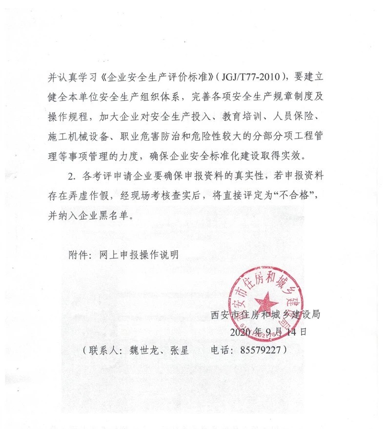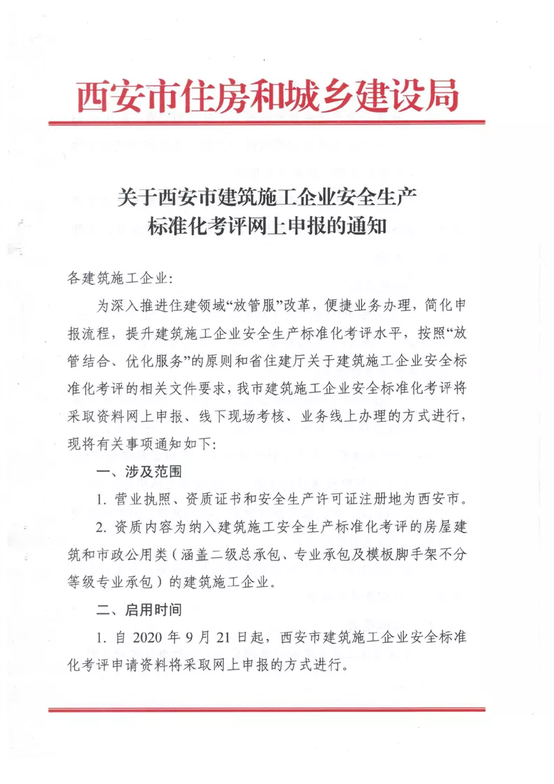 “ 9月15日,西安市住房和城鄉(xiāng)建設(shè)局發(fā)布關(guān)于西安市建筑施工企業(yè)安全生產(chǎn)標(biāo)準(zhǔn)化考評(píng)網(wǎng)上申報(bào)的通知。”